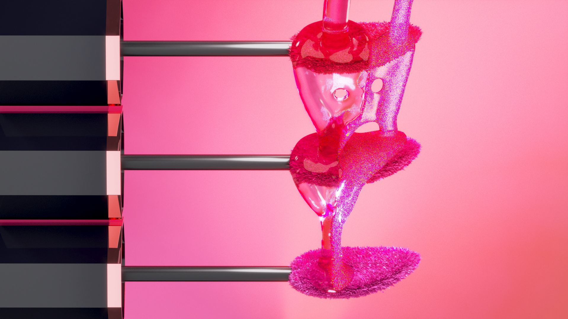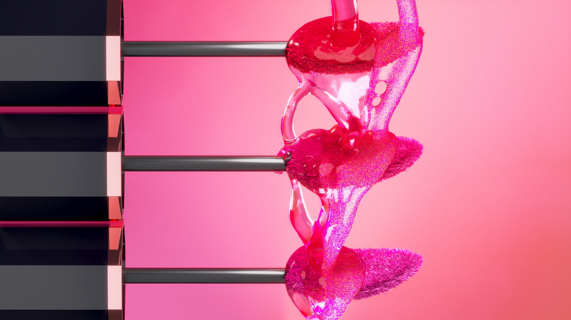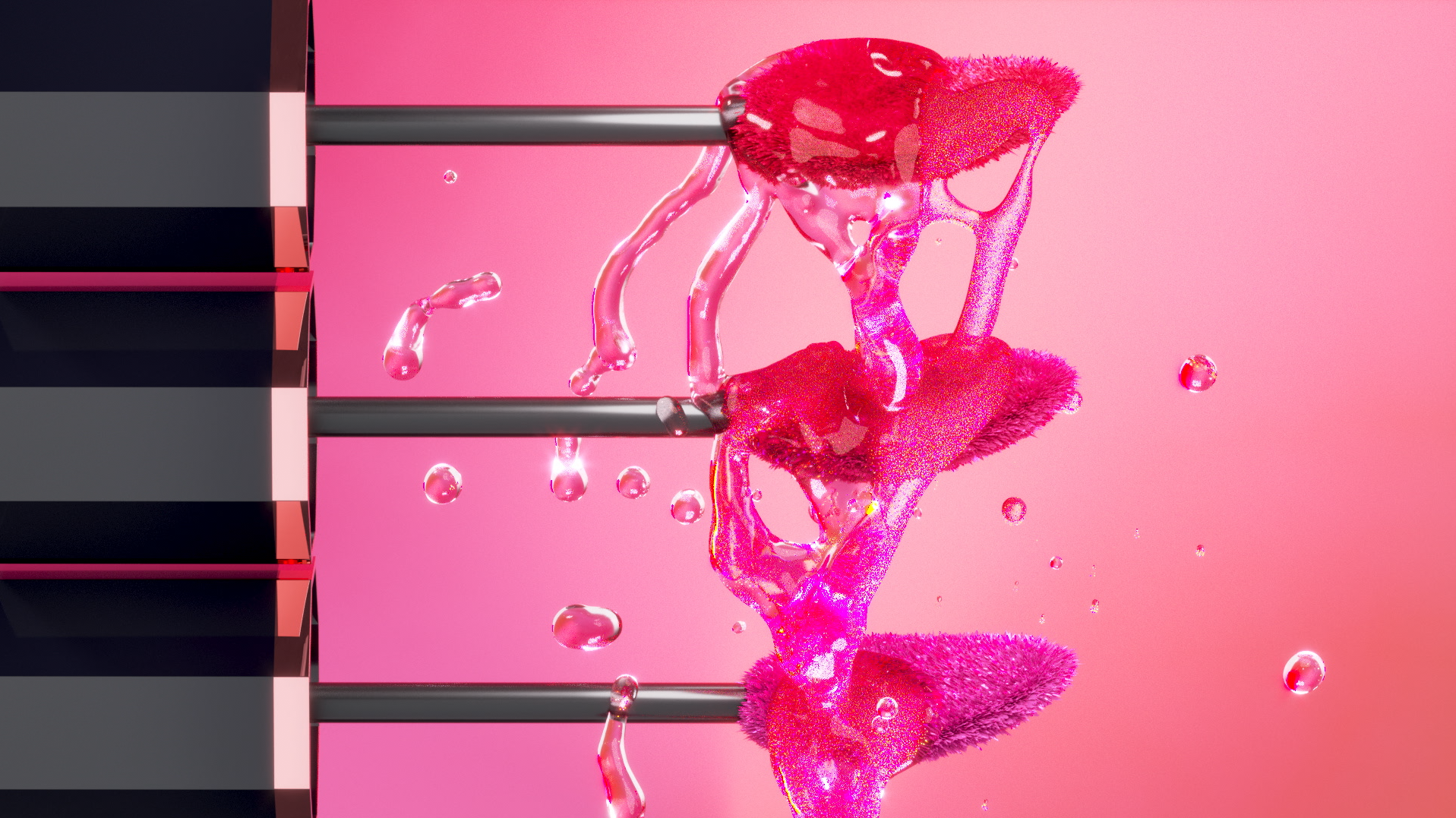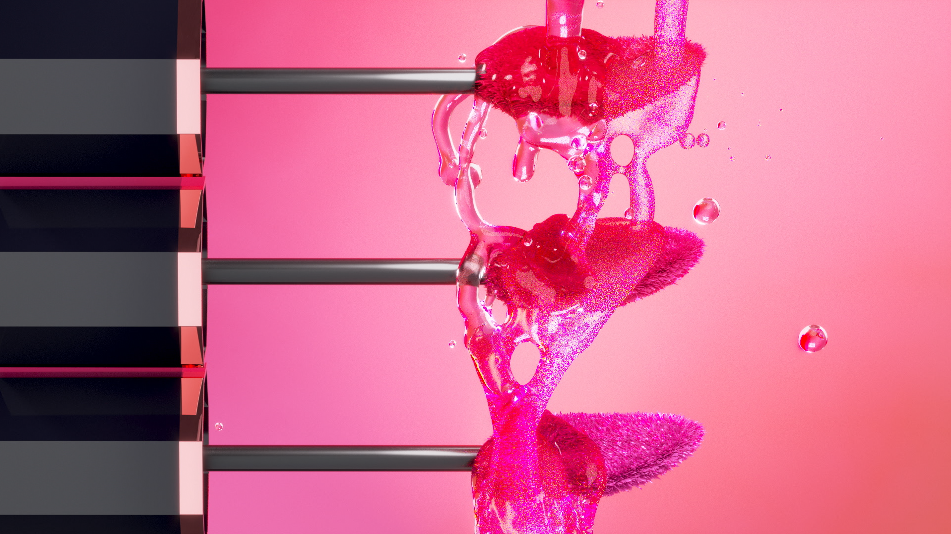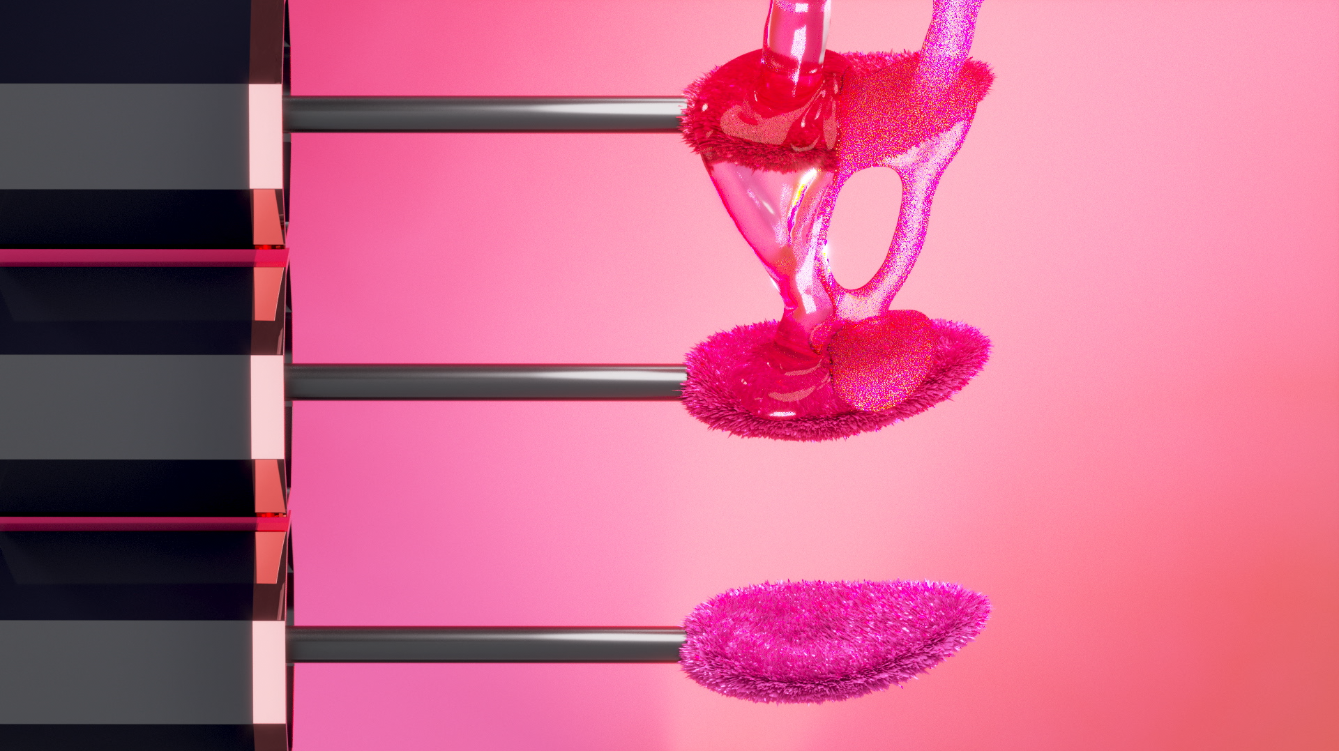 An experimental study in fluid motion and gloss and sparkle, created to test new techniques for simulating cosmetic textures.