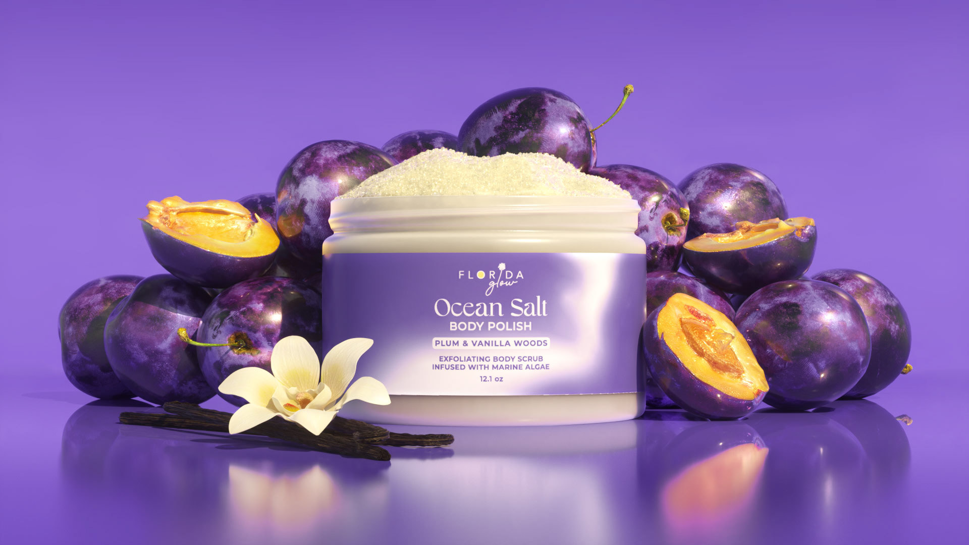 A styleframe exploring the fresh, crystalline aesthetics of ocean salt in a beauty context.